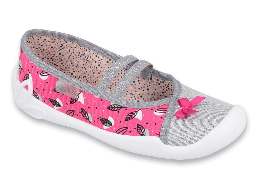 Lehká obuv na přezutí umožňuje dítěti naprostou volnost, tím spíše, pokud je její podrážka ohebná. Při běhu školními chodbami je noha účinně podepřena praktickým elastickým páskem. Bačkory jsou vyrobeny z přírodních bavlněných látek, hodí se k mnoha outfitům.