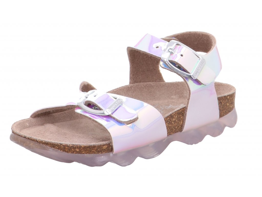 Nazouvací přezůvky značky Superfit, anatomicky tvarovaná kožená stélka na korkovém podkladu, nebarvící protiskluzná podešev, možnost upravit šířku pásky na přezky.