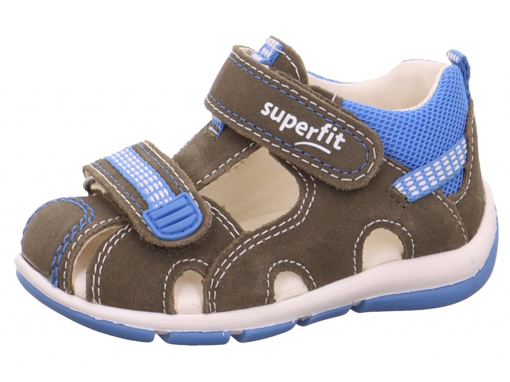 Sandálky značky Superfit s krytou špičkou a zapínáním na dva suché zipy. Boty mají maximálně ohebnou podešev, kvalitní koženou stélku a opatek, který drží kotník dítěte ve správné poloze.