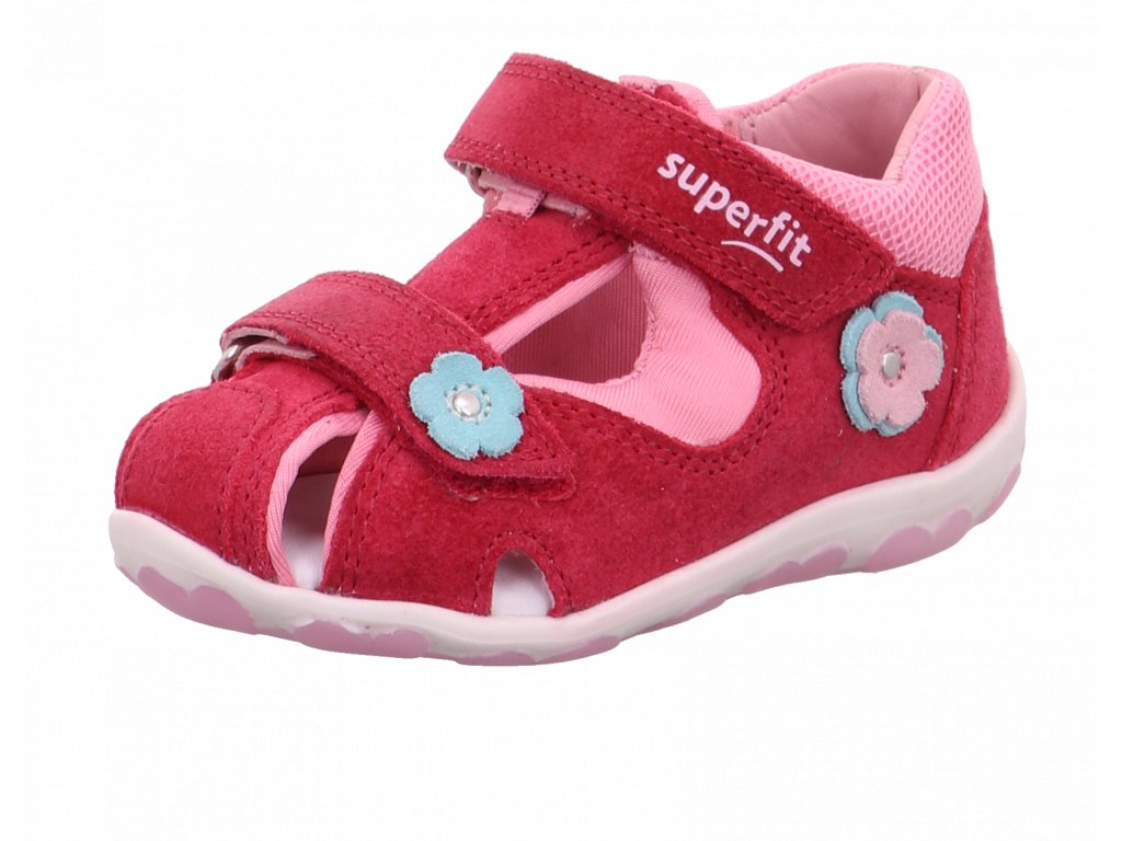 Sandálky značky Superfit s krytou špičkou a zapínáním na dva suché zipy. Boty mají maximálně ohebnou podešev, kvalitní koženou stélku a opatek, který drží kotník dítěte ve správné poloze.